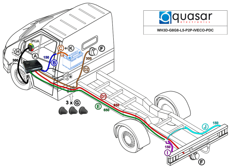 The kit includes wire harness of exact length (precisely for this car's model). Special advantage kit advantage is a possibility of connection to the existed plugs and sockets of car's electrical system without cutting. This kit differs from the STD kit (IVECO 2021-2024) in the adjusted lamp harness lengths at the rear of the car. Installation location of central unit is cabin interior on the left hand side of a car.
